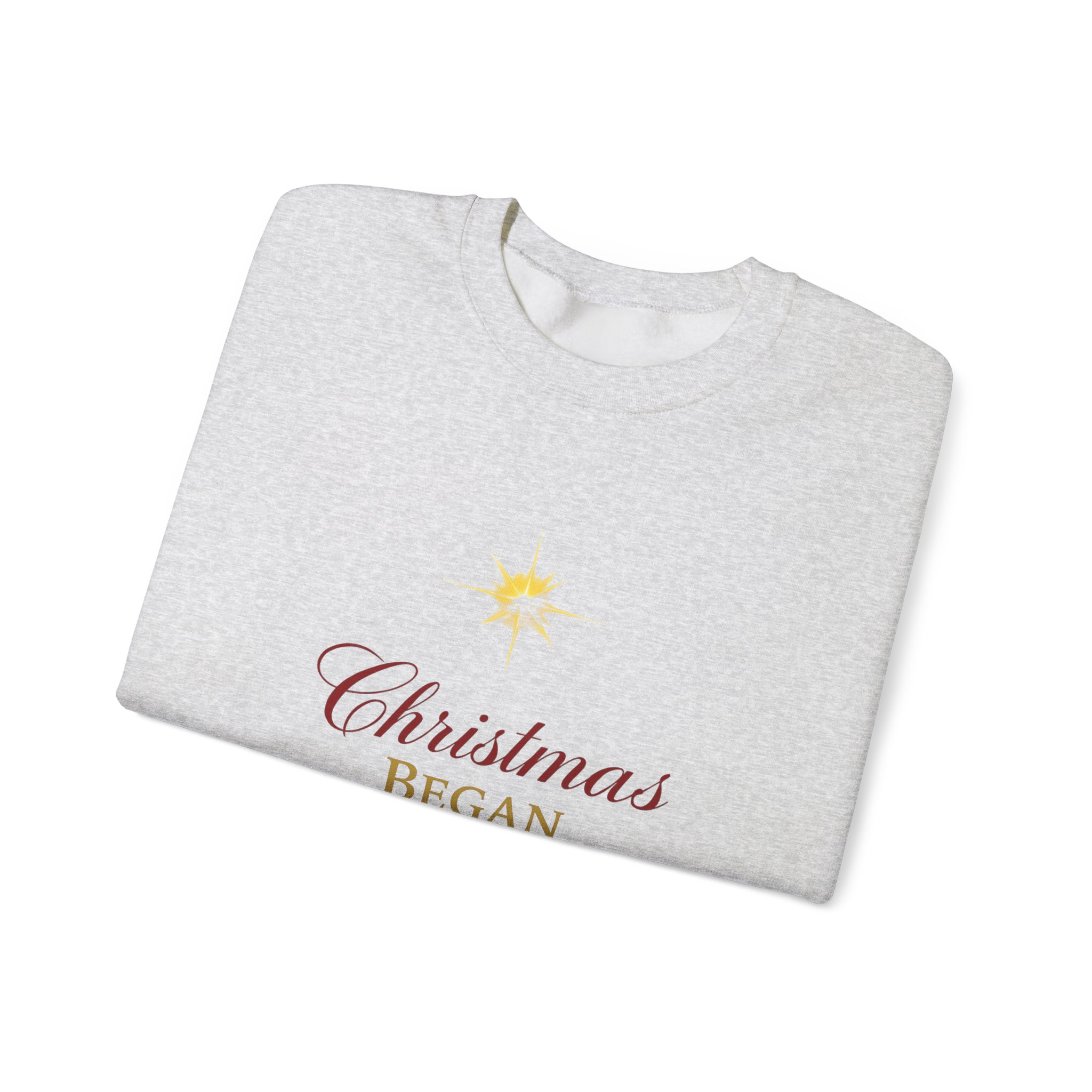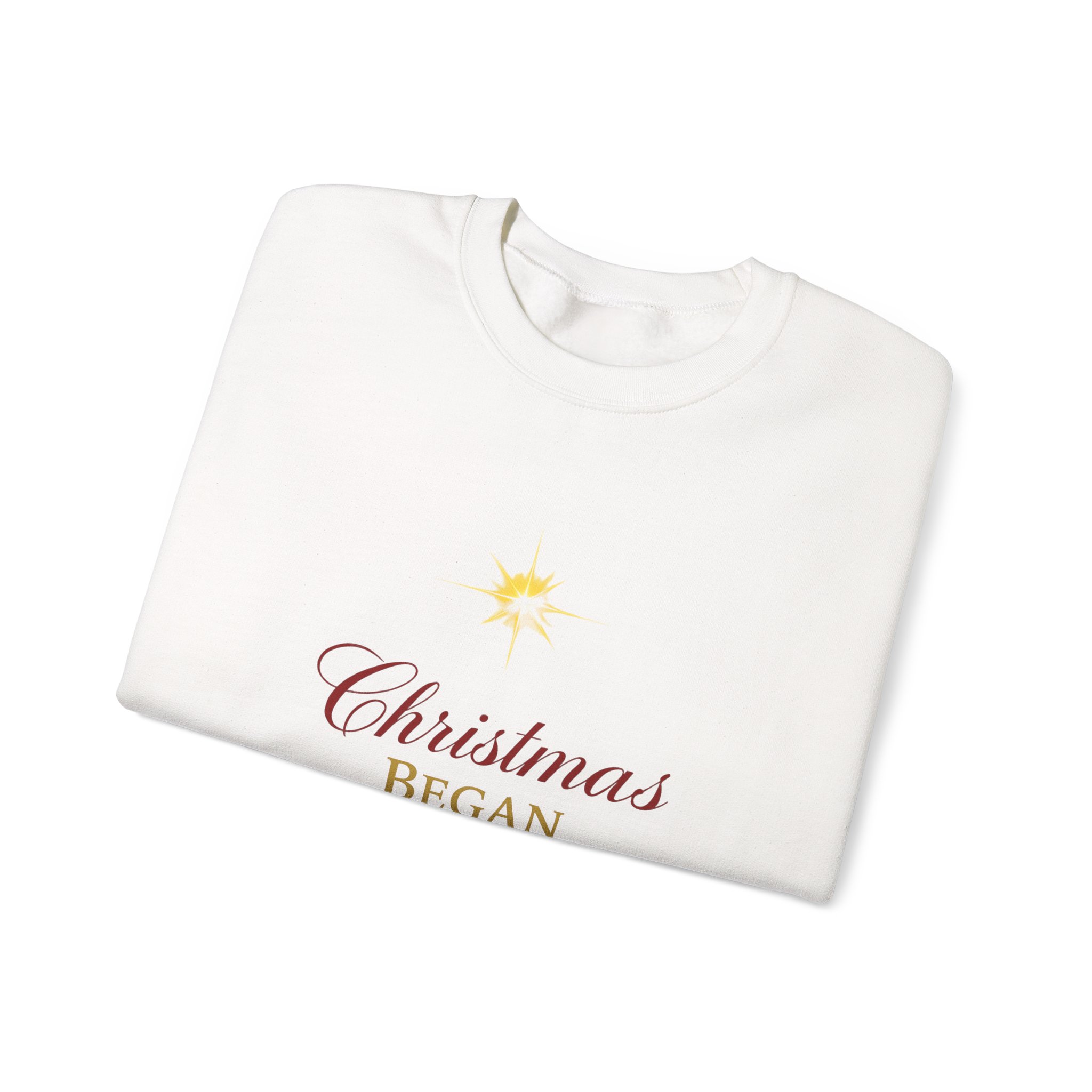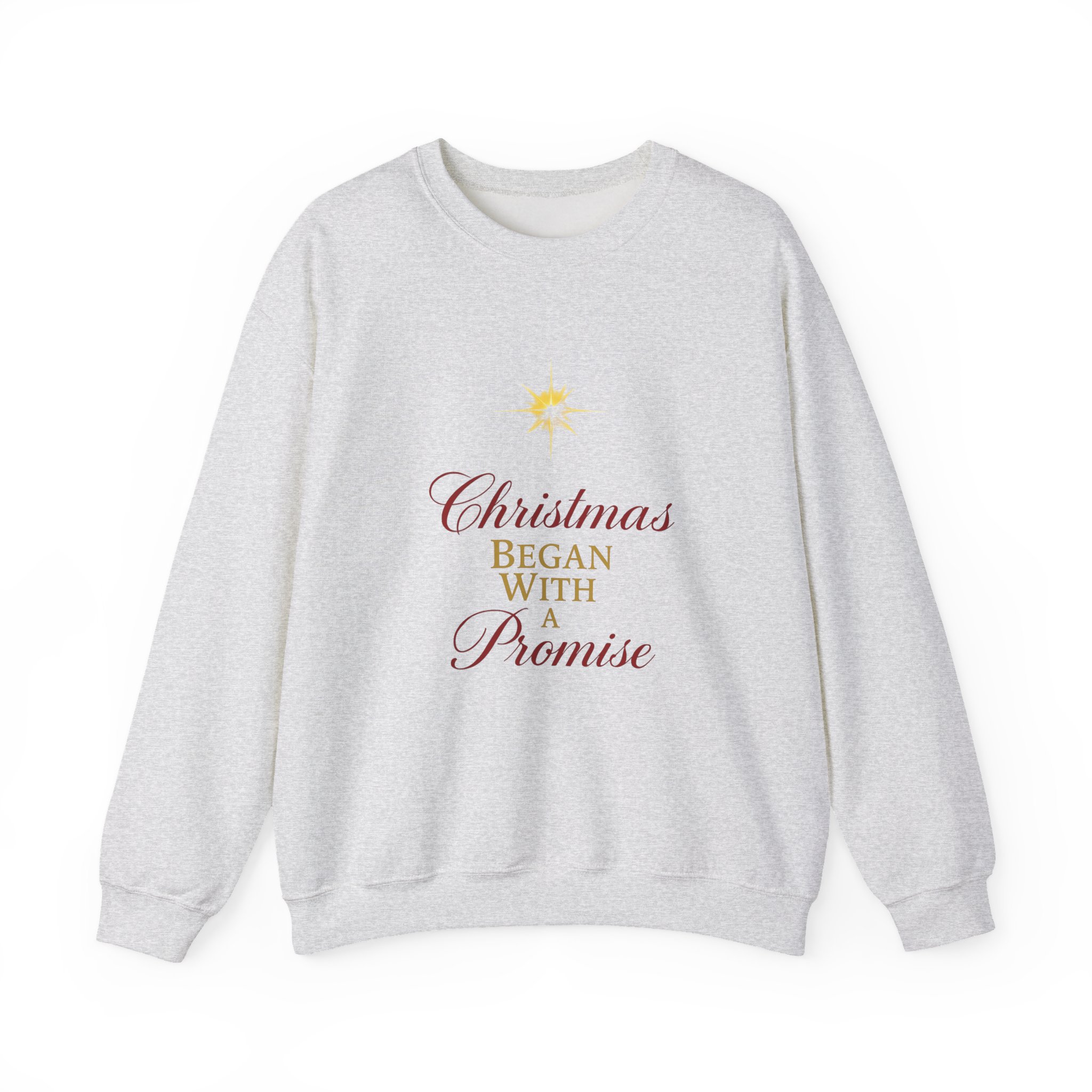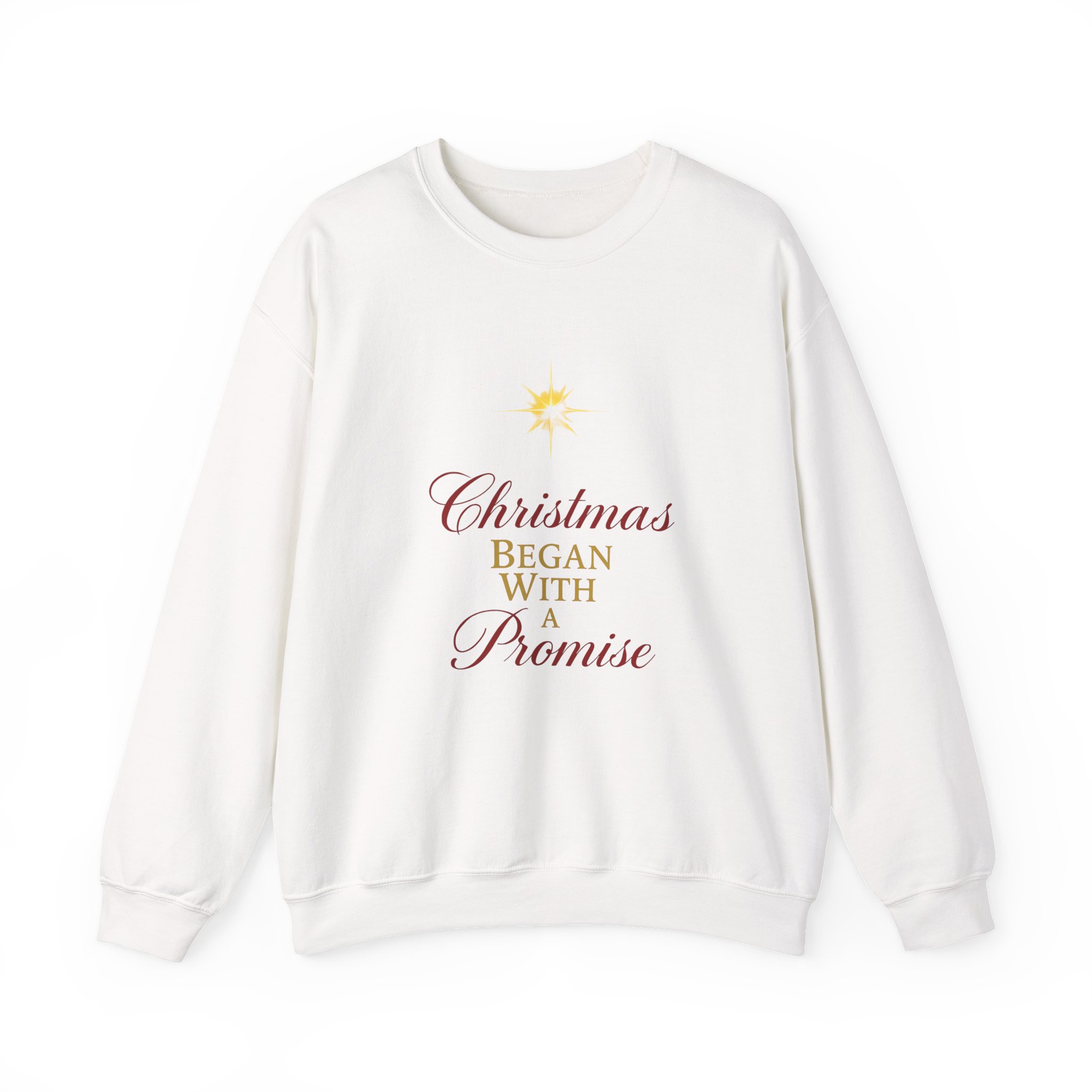 Soft, warm crewneck sweatshirt embroidered with a gentle holiday message: “Christmas Began With A Promise” beneath a subtle golden star. The clean white fabric and refined script give it a quiet, reverent feel — like the hush of a winter morning in church or a candlelit family gathering. Wear it when you want your wardrobe to reflect a calm, faith-centered celebration: layered over a collared shirt for choir night, paired with jeans for a casual Christmas brunch, or kept on for cozy evenings by the tree. The fit is timeless and roomy enough to move freely while the embroidered detail keeps the sentiment front and center without shouting. This sweatshirt blends durable construction and responsibly sourced materials with a look that feels both familiar and thoughtful.