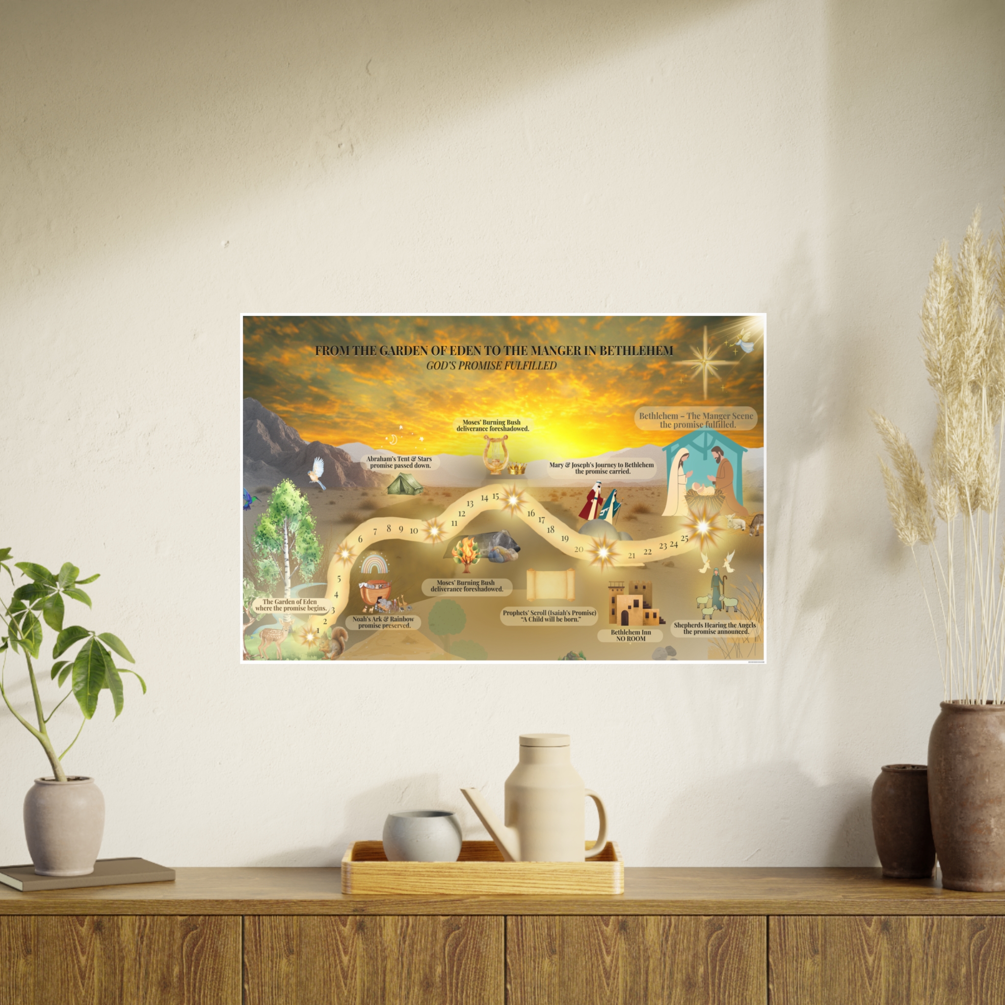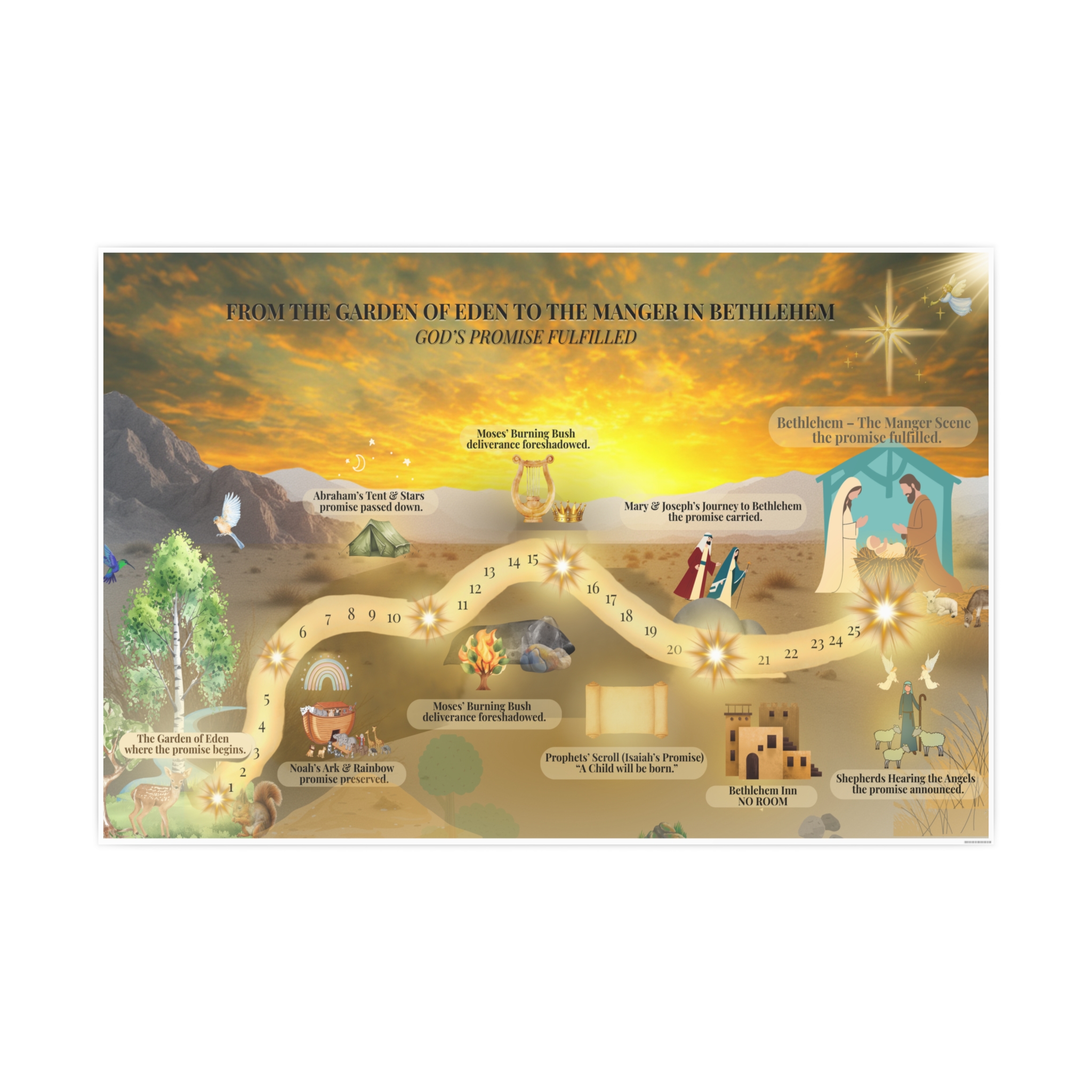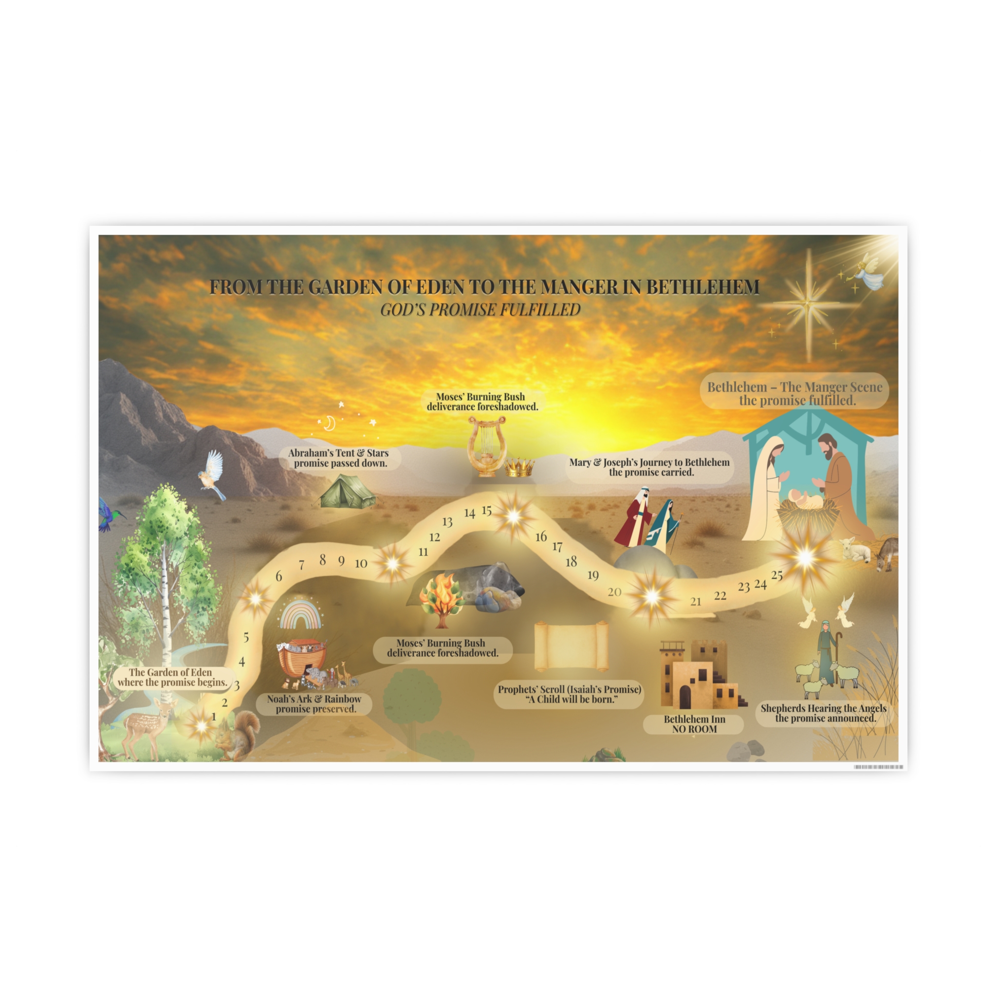 A beautifully illustrated Christian journey map that leads from Eden to Bethlehem, showing God’s promise fulfilled through Scripture. Perfect for family rooms, homeschool spaces, Sunday school classrooms, and Advent devotionals. Available in three horizontal sizes.