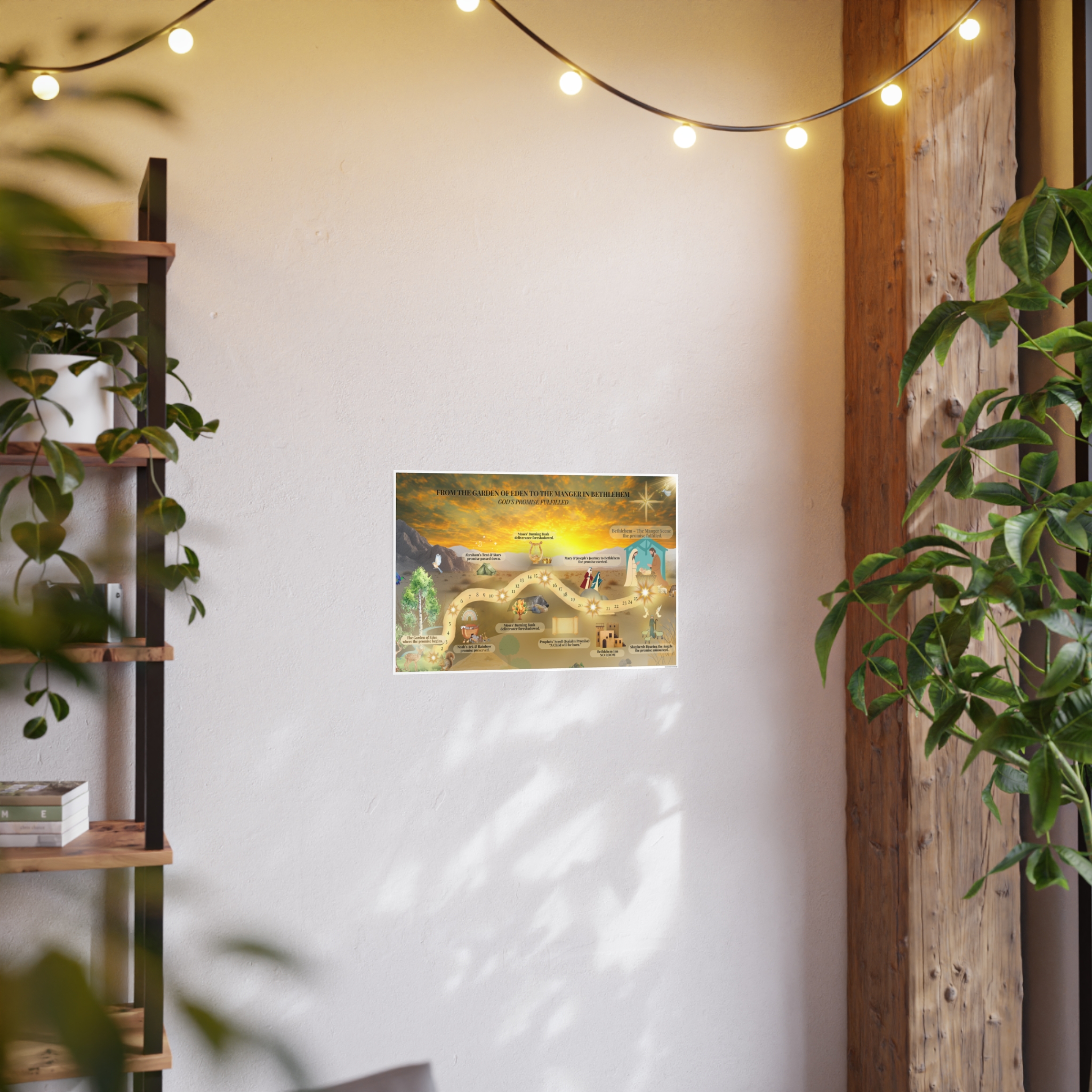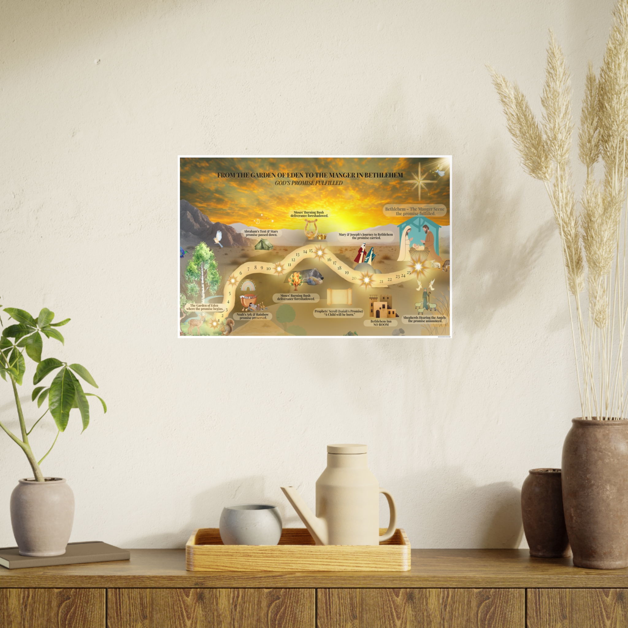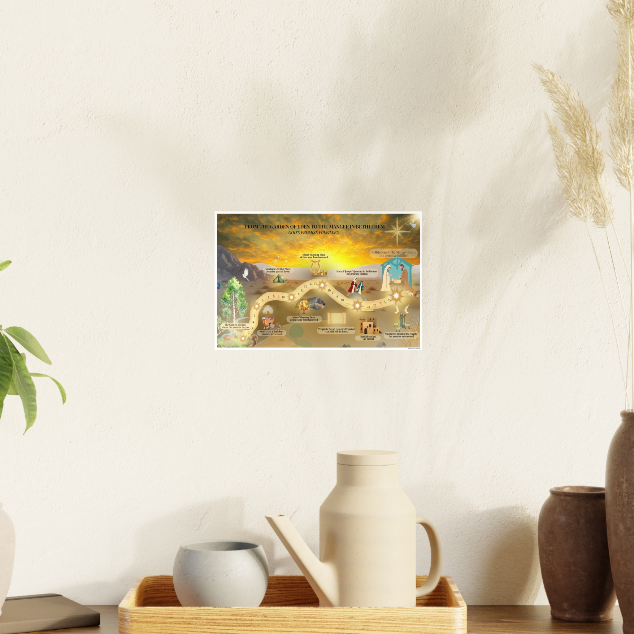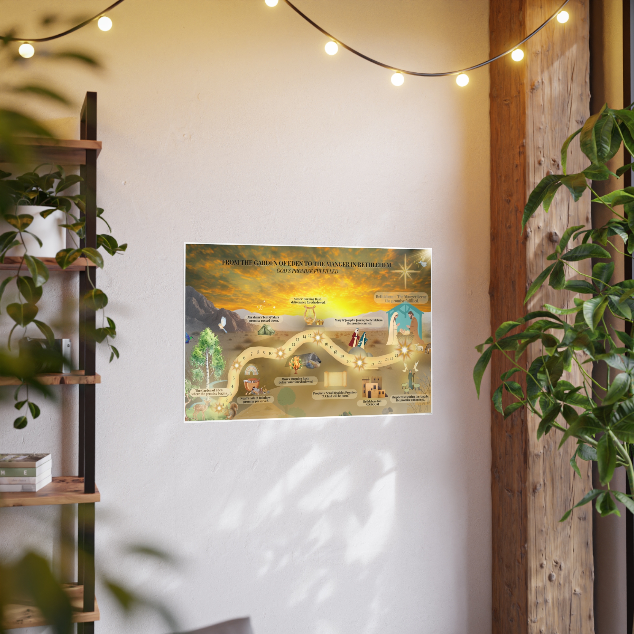 A beautifully illustrated Christian journey map that leads from Eden to Bethlehem, showing God’s promise fulfilled through Scripture. Perfect for family rooms, homeschool spaces, Sunday school classrooms, and Advent devotionals. Available in three horizontal sizes.
